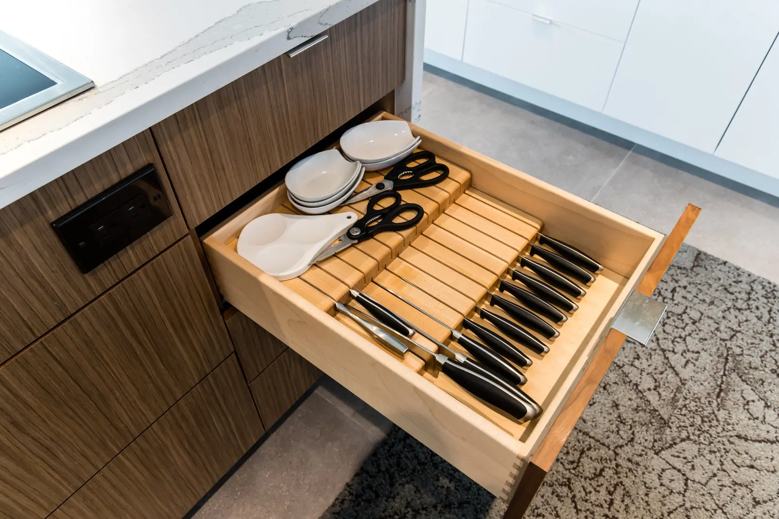At the heart of the kitchen is a striking Cambria Brittanicca quartz waterfall island, paired with a raised walnut bar top that adds warmth and depth. This dual-waterfall design not only anchors the room visually but also creates a distinct social space for entertaining.