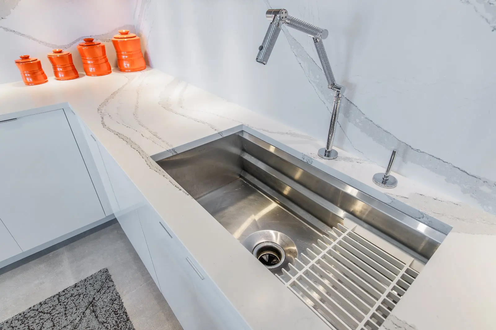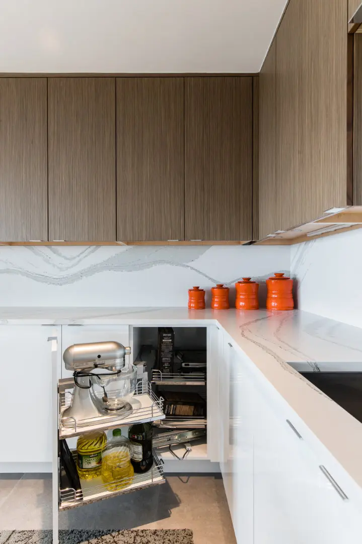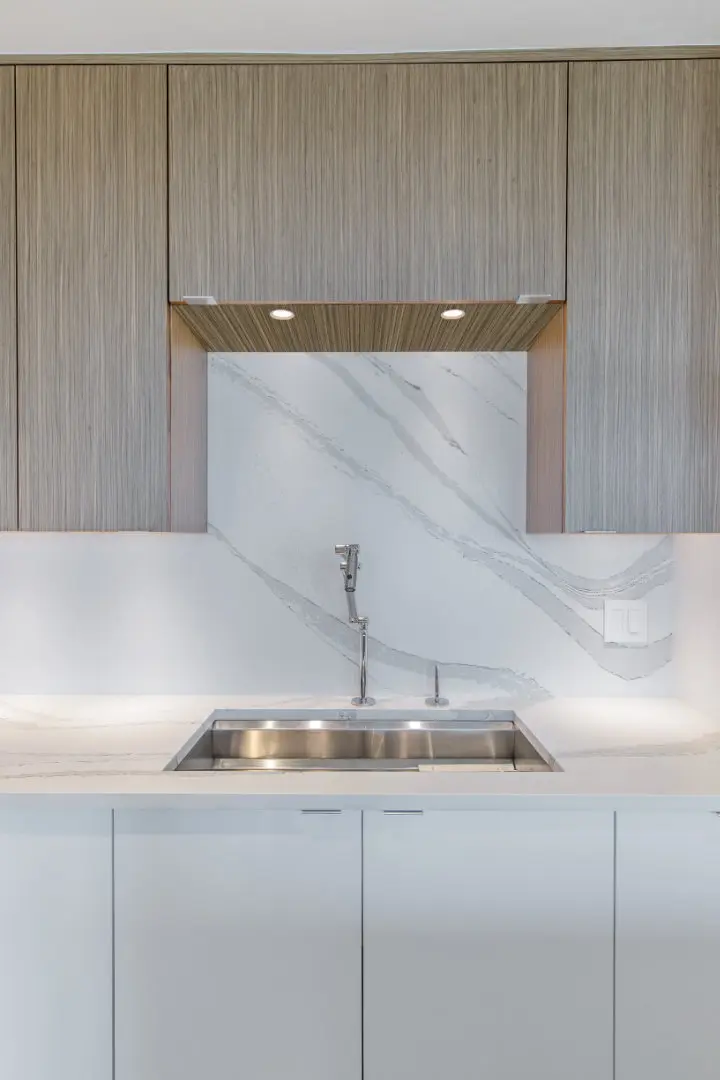 The cabinetry features vertical-grain walnut uppers that mirror the island’s organic texture, contrasted by high-gloss white lower cabinets and tall storage that reflect light and keep the palette clean and modern. Full-height quartz slabs extend from countertop to ceiling for a bold, seamless backsplash.