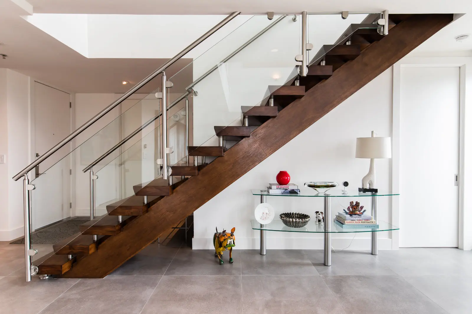 The floating glass-and-metal hood adds sculptural clarity without obstructing sightlines, and concealed lighting enhances both ambiance and efficiency.