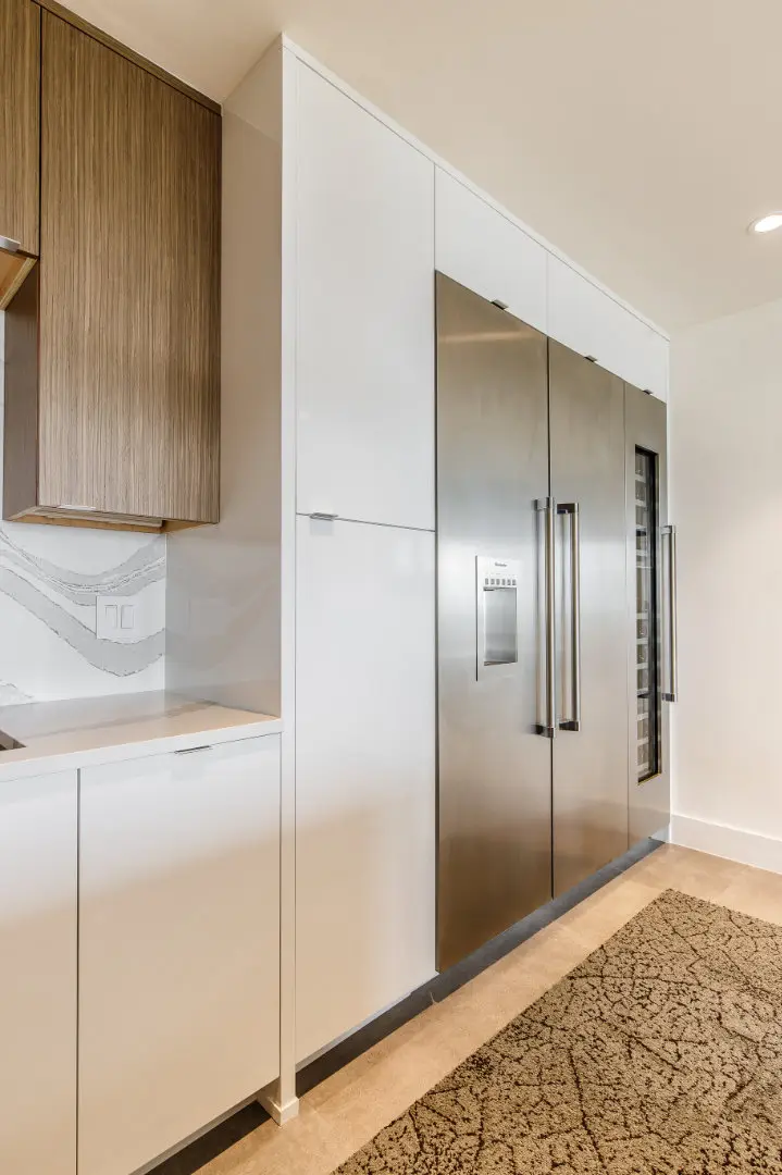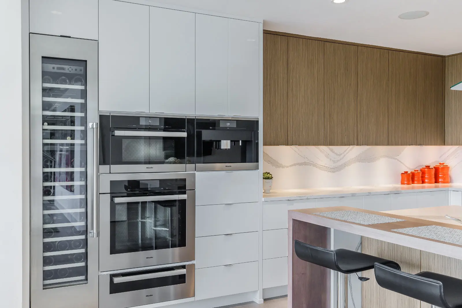 This penthouse kitchen remodel in Dallas was also built for performance. Integrated Miele appliances—such as a built-in coffee system, steam oven, and wine tower—offer professional-grade functionality without disrupting the streamlined aesthetic. Thermador column refrigerator and freezer units provide balance and symmetry along the back wall, while smart touches like pop-up outlets, soft-close drawers, and appliance garages keep the space highly usable.